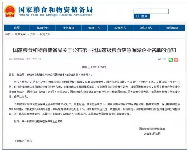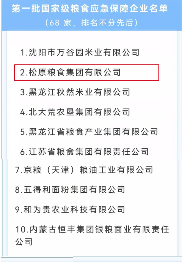松粮集团作为吉林省唯一一家企业被国家粮食和物资储备局认定为第一批“国家级粮食应急保障企业”,松粮集团将服从国家粮食和物资储备局统一指挥和调度,积极发挥粮食应急保障企业保供稳市作用,加强粮食应急保障体系建设,有效提升应对突发事件能力,确保国家粮食安全。
